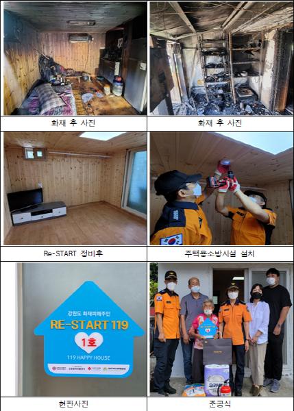 Re-START 119는 화재피해주민의 신속한 재기(재도약)를 돕기 위해 강원소방에서 올해부터 추진하는 신규 사업으로, 화재피해폐기물 처리와 청소, 도배·장판, 기초소방시설 설치 등을 지원한다.