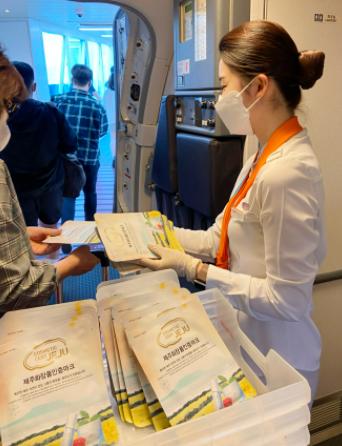 기내 안내방송과 함께 홍보용 마스크팩, 마스크(KF94)로 구성된 키트 1만5,000매를 제공할 예정이다.