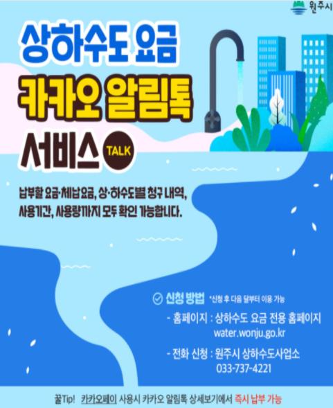 원주시 카카오 알림톡 서비스는 상하수도요금을 기존 종이 고지서 대신 카카오톡을 통해 모바일 전자 고지서로 안내해 주는 서비스다.