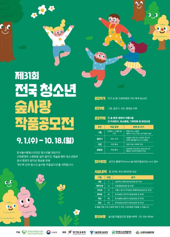 공모 결과 우수작품은 대상(농림축산식품부장관상 5명), 최우수상(산림청장상 16명), 우수상(서울시·경기도 교육감상·청소년단체협의회장상 24명) 등 모두 213점을 선정할 계획으로 최종 발표는 11월 중 예정이다.