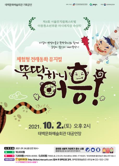 태백시는 오는 10월 2일 오후 2시 태백문화예술회관 대공연장에서 ‘뚝딱하니 어흥 !’공연을 개최한다.