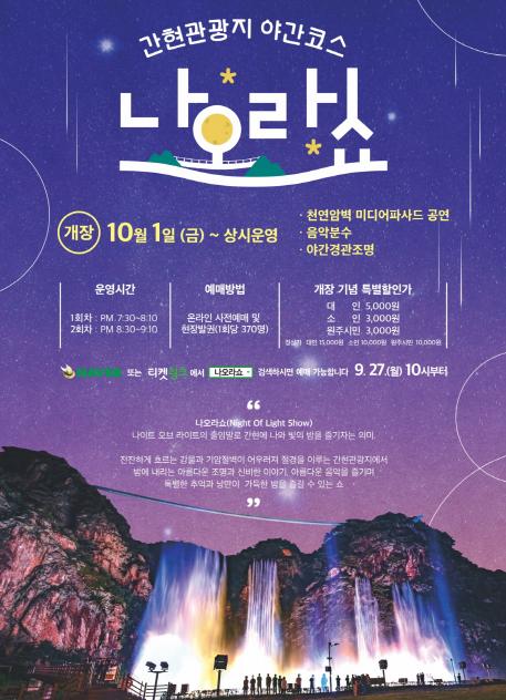 간현관광지의 낭만적인 밤을 즐길 수 있는 야간코스 나오라쇼가 오는 10월 1일 개장한다.