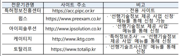 선행기술조사 전문기관에서 운영하는 아래 사이트들 중 선행기술정보를 제공받고 싶은 기관의 사이트에 접속해 신청할 수 있으며, 본 사업에 대한 보다 상세한 정보도 확인할 수 있다.