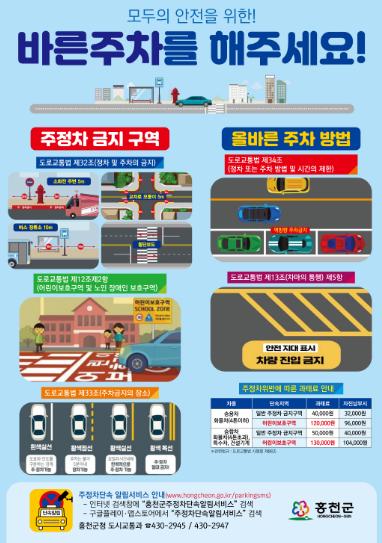 홍천군은 교통안전을 위협하는 행위를 근절하고자 주정차 단속구역 및 읍내 시가지 노상주차장에 역방향으로 주정차한 차량을 대상으로 지속적인 단속을 실시할 방침이라고 밝혔다.