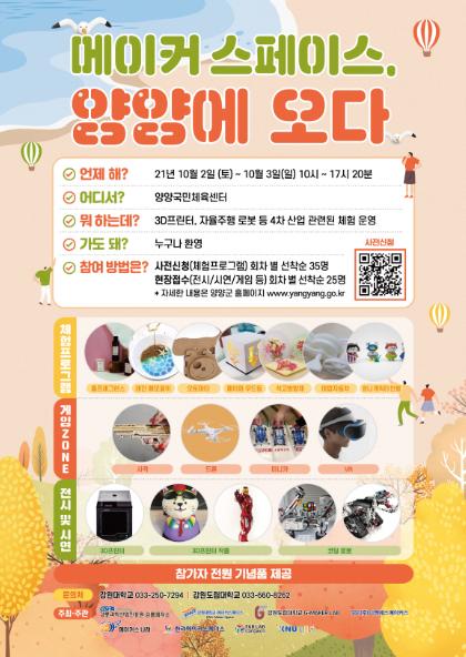 강원대, 강원도립대, 한림대 등 7개 기관이 참여하는 이번 행사는 오는 10월 2일~3일 2일간 양양국민체육센터에서 1일 4회씩 총 8회에 걸쳐 진행된다.