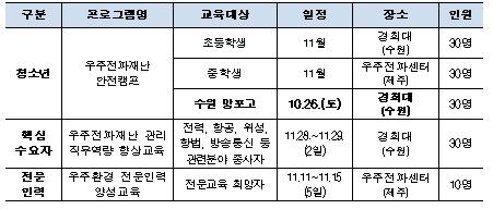 교육 프로그램은 청소년을 위한 ‘우주전파재난 안전캠프’, 핵심수요자를 위한 ‘우주전파재난 관리 직무역량 향상교육’ 및 우주환경 전문 교육 희망자를 위한 ‘우주환경 전문인력 양성교육’으로 구성되어 있다.
