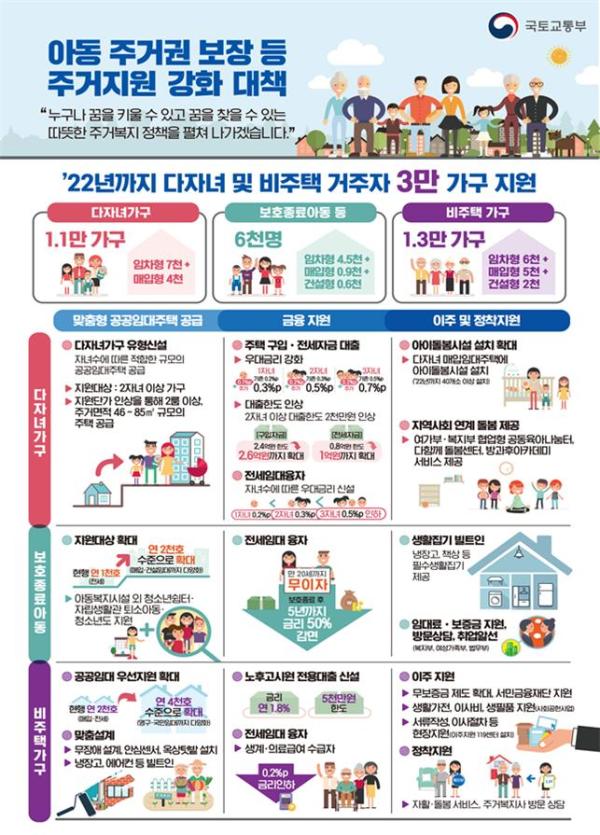 2022년까지 다자녀 가구 1.1만호, 보호종료아동 6천호의 맞춤형 공공임대주택을 우선 지원한다.