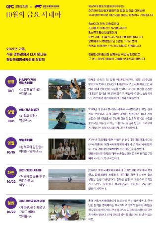 강원영상위원회는 도내 작은영화관 활성화 및 문화 소외지역의 영상문화 향유 기회를 제공하기 위하여 2021 평창국제평화영화제(PIPFF) 우수작을 재상영하는 행사, ‘10월의 금요시네마’를 추진한다.