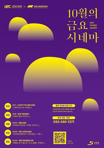 평창국제평화영화제가 강원영상위원회와 함께 '10월의 금요시네마'를 개최한다. 평창국제평화영화제 상영작 순회상영전으로 영화제에서 큰 사랑을 받았던 '소중한 날의 꿈', '비밀의 정원', '성적표의 김민영', '박강아름 결혼하다', '메밀꽃, 운수 좋은 날, 그리고 봄봄'이 상영되며 영화 상영 후에는 감독과의 대화 시간을 진행, 관객들과 함께 소통하는 자리도 마련된다. 이번 행사는 강원영상위원회와 강원도 내 작은 영화관들이 협력해 진행하며 평창과 양양, 영월, 화천, 철원에서 매주 금요일 오후 7시에 무료 상영된다.