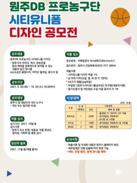원주시는 건강도시 원주를 상징할 수 있는 요소가 반영된 원주DB 프로농구단 시티유니폼을 통해 원주시 브랜드를 홍보하고 원주시와 원주DB 프로농구단의 공동마케팅을 추진하고자 전 국민 대상 시티유니폼 공모전을 실시한다고 밝혔다.