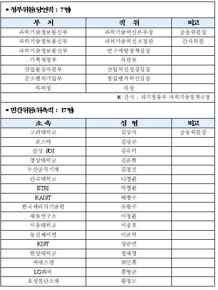 정부위원으로는 기재부 차관보 과기정통부 과학기술혁신조정관 과기정통부 연구개발정책실장 산업부 산업혁신성장실장 중소벤처부 창업벤처혁신실장 특허청 차장 이 참여하며,