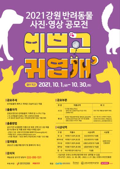 강원디자인진흥원과 예술공공이 공동주최 및 주관으로 2021 강원 반려동물 사진·영상 공모전 '예쁘고 귀엽개' 를 개최한다.