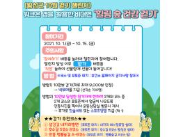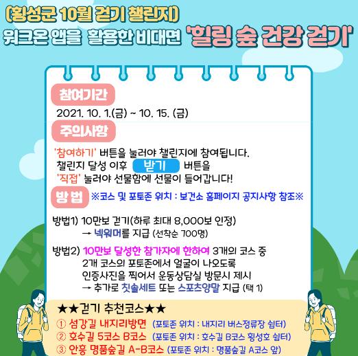 횡성군보건소는 모바일 앱‘워크온’은 활용한 비대면 ‘힐링 숲 건강 걷기’행사를 10월 1일부터 10월 15일까지 개최한다.