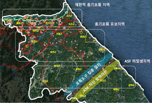 이번 집중포획에 앞서, 강원도는 ASF의 선제적 차단 대응을 위해 작년 12월부터 올해 3월말까지 강원 중부권 5개 시‧군을 통합한 전국 최초, 최대 규모의 ‘광역수렵장’을 운영한 바 있으며,