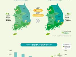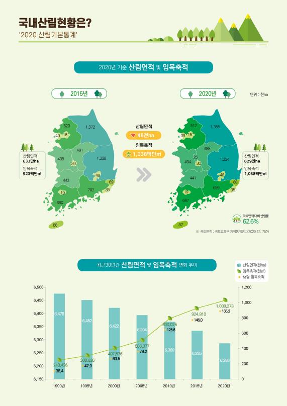 이번 통계에서는 2020년 기준 산림면적은 629만ha로 국토의 62.6%를 차지하는 것으로 나타났다. 또한, 지속적인 숲가꾸기 활동으로 임목축적(나무의 재적)이 2015년에 비해 13% 증가하였다.