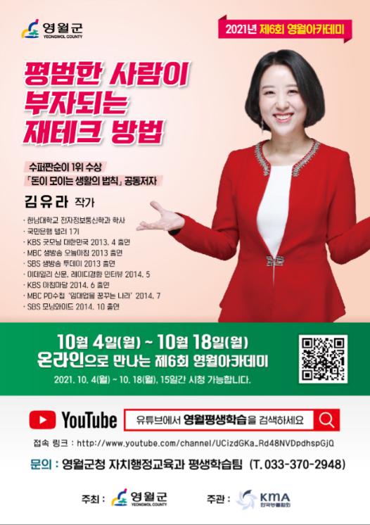 영월군은 10월 4일부터 10월 18일까지 15일간 제6회 영월아카데미를 비대면 온라인 강좌로 진행한다.
