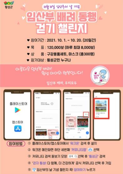 횡성군보건소는 오는 10월 10일, 제16회 임산부의 날을 맞이하여, 임산부 배려 문화 확산을 위한‘임산부 배려 동행 걷기 챌린지’를 실시한다고 밝혔다.