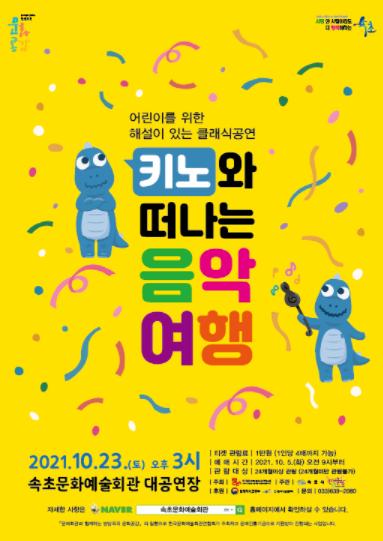 속초시가 10월 23일 토요일 오후 3시 속초문화예술회관에서 ‘어린이들을 위한 해설이 있는 클래식공연공룡키노와 떠나는 음악여행’을 개최한다.