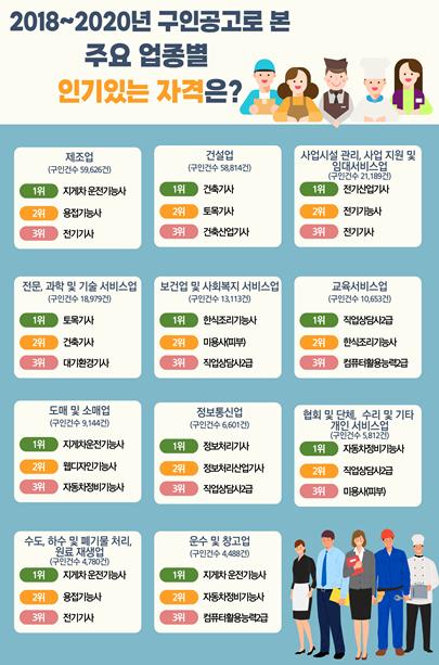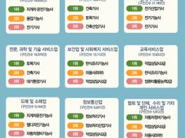 특히 건설분야(건축기사 2위, 토목기사 5위, 건축산업기사 11위)와 전기분야(전기기사 4위, 전기산업기사 6위, 전기기능사 7위, 전기공사산업기사 14위)는 많은 종목이 상위 순위에 포함되어 있어 취업할 때 자격증을 가진 사람이 유리한 분야로 나타났다.
