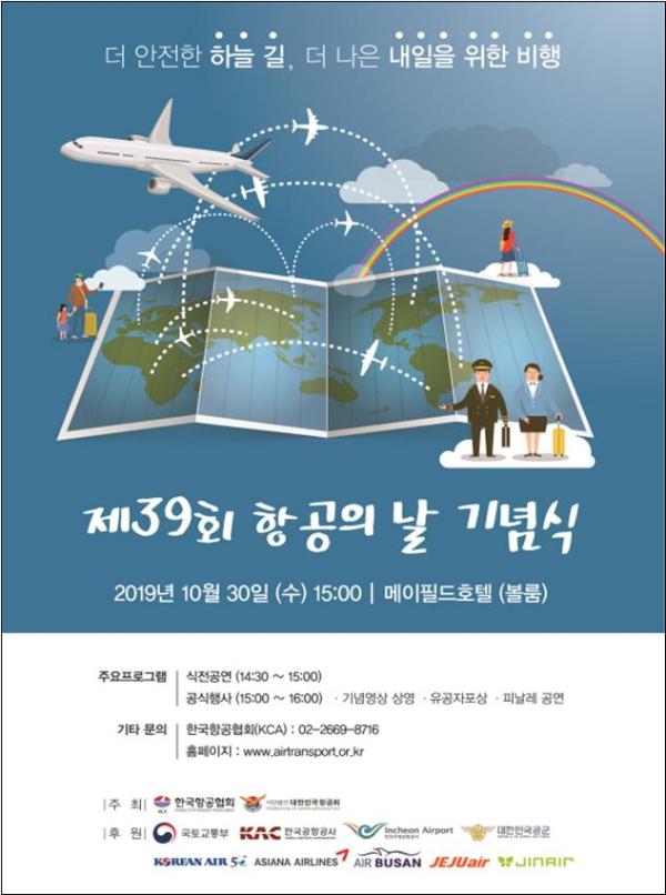 국토교통부는 오는 30일, 서울 메이필드 호텔에서 김성태·윤관석 국회의원, 공군참모차장, 학계, 항공업계 등 각계 인사가 참석한 가운데 ‘제39회 항공의 날 기념식’을 개최한다고 밝혔다.