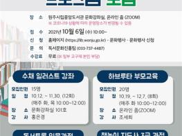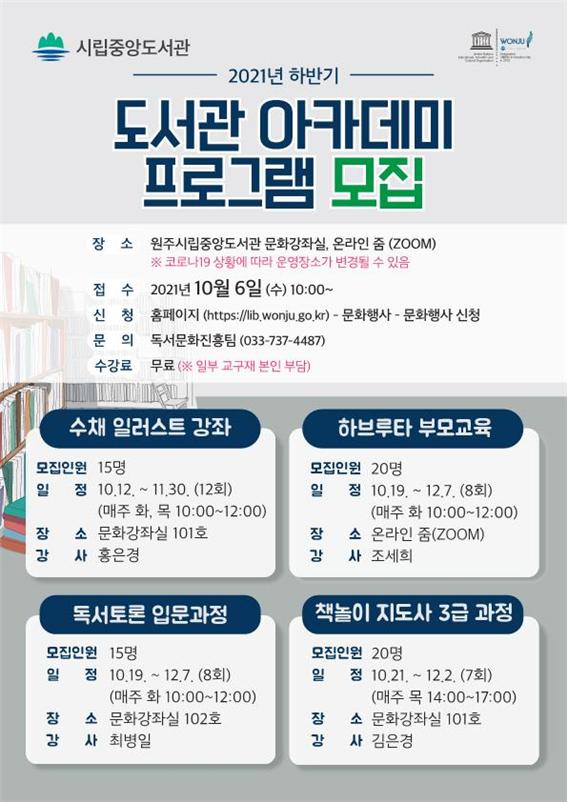 원주시립중앙도서관은 2021년 하반기 도서관 아카데미 프로그램에 참여할 수강생을 10월 6일 오전 10시부터 홈페이지를 통해 선착순 모집한다.