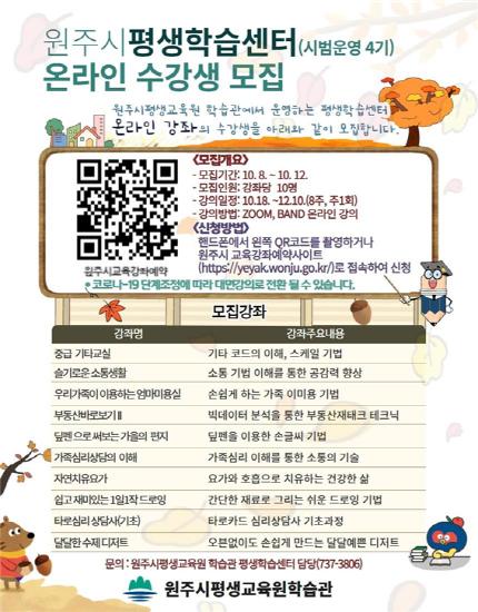원주시 평생교육원 학습관은 평생학습센터 시범사업 4기에 참여할 수강생을 8일부터 12일까지 5일간 원주시 교육강좌 예약 홈페이지를 통해 모집한다.
