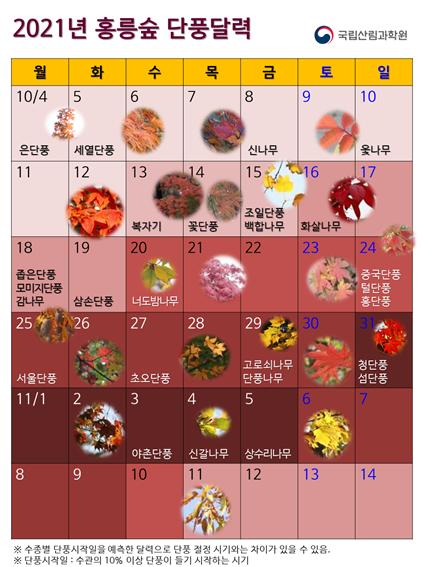 산림청 국립산림과학원은 서울 홍릉숲 내 나무들의 단풍 시작 예상일을 담은 「2021년 홍릉숲 단풍달력」을 발표했다.