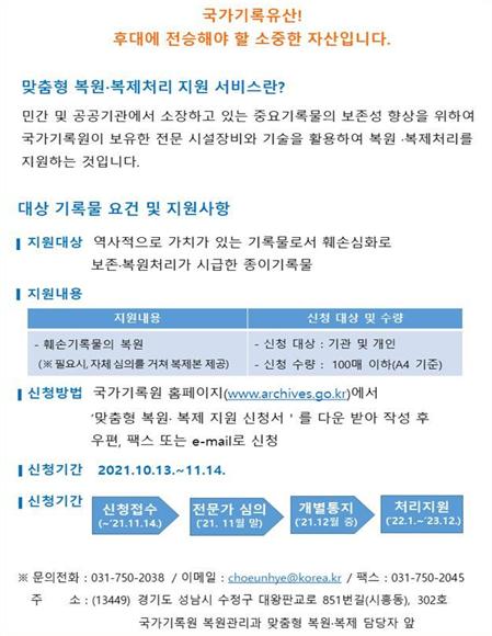 올해 맞춤형 복원·복제 서비스 신청기간은 10월 13일부터 11월 14일까지이며 보존가치가 있는 국가적으로 소중한 기록물이라면 개인, 민간기관, 공공기관 등 누구나 무료로 신청 가능하다.