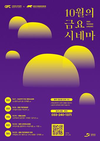10월 22일 화천 산천어시네마에서는 박강아름 감독의 '박강아름 결혼하다', 10월 29일 철원 작은영화관 뚜루에서는 안재훈 감독의 한국 단편 애니메이션 '메밀꽃, 운수 좋은 날, 그리고 봄봄'이 상영된다. 이번 행사는 강원영상위원회와 강원도 내 작은영화관들이 협력해 진행하며 매주 금요일 오후 7시에 무료 상영된다.