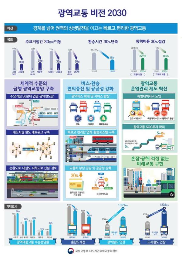 이번에 발표한 ‘광역교통 2030’은 앞으로 10년간 대도시권 광역교통의 정책 방향과 광역교통의 미래모습을 제시하는 기본구상으로 “광역거점간 통행시간 30분대로 단축”, “통행비용 최대 30% 절감”, “환승시간 30% 감소”의 3대 목표를 제시하고 이를 달성하기 위해, 세계적 수준의 급행 광역교통망 구축, 버스·환승 편의증진 및 공공성 강화, 광역교통 운영관리 제도 혁신, 혼잡·공해 걱정 없는 미래교통 구현의 4대 중점 과제와 대도시권 권역별 광역교통 구상을 담고 있다.