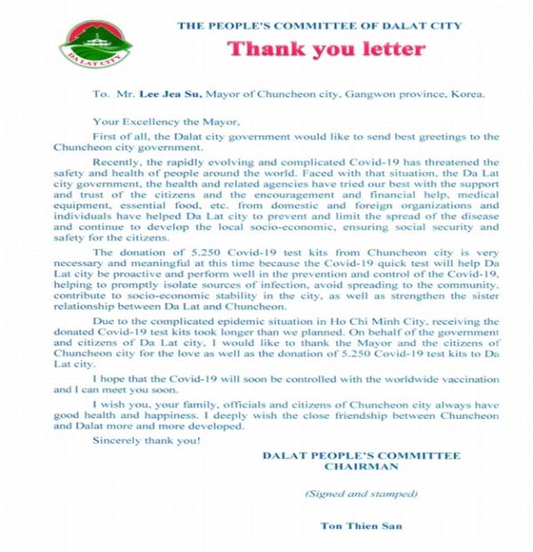 이어 “호치민시의 봉쇄로 진단키트 수령이 오래 걸렸지만 달랏시와 시민을 대표해 춘천시장님과 춘천시민들의 애정과 격려에 감사를 표하고 싶다”라며 “춘천과 달랏의 우정이 해가 갈수록 더 돈독해 지길 바란다”라고 편지를 끝맸었다.