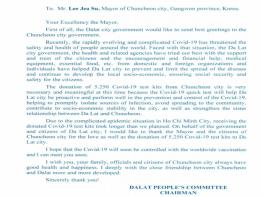 시정부 관계자는 “진단키트 지원 이후 뜻밖의 감사 편지를 받게 돼 감동”이라며 “앞으로도 달랏과의 우정을 꾸준히 이어나가겠다”라고 말했다.