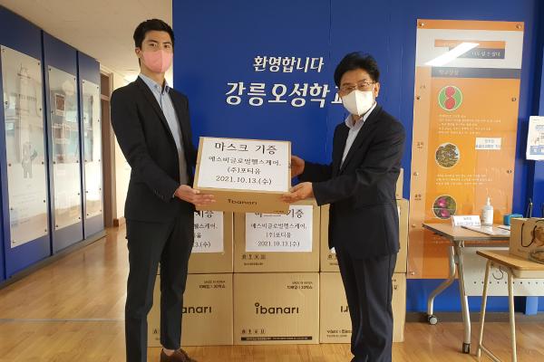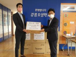 이날 오후에는 ㈜포티움 엄성흠 대표가 강릉 오성학교에 방문하여 기증품 전달식을 진행하였으며 기증받은 마스크는 도내 특수학교 8개교에 전달하여 특수학교 학생들의 감염병 예방을 위해 쓰일 예정이다.