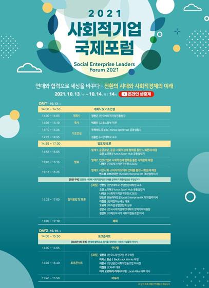 고용노동부가 주최하고, 한국사회적기업진흥원이 주관하는 「2021 사회적기업 국제포럼」이 10.13.~10.14. 양일간 페럼타워(서울 중구)에서 개최됐다.