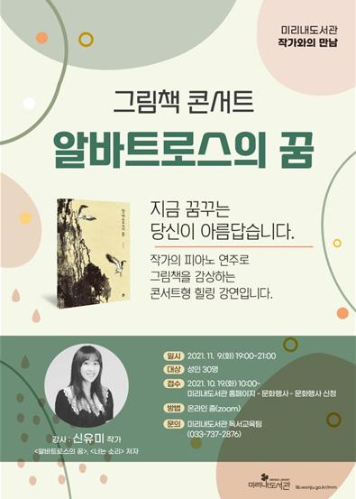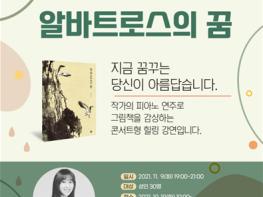 '알바트로스의 꿈', '너는 소리'의 저자 신유미 작가를 초청해 11월 9일 저녁 7시부터 9시까지 온라인 줌(zoom)을 활용한 그림책 콘서트 ‘알바트로스의 꿈’을 진행한다.