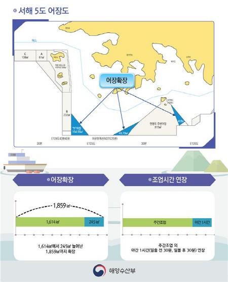 해양수산부는 서해 5도 어장을 현행 1,614㎢에서 245㎢ 늘어난 1,859㎢까지 확장하고, 1964년부터 금지되었던 야간조업도 55년 만에 일출 전, 일몰 후 각 30분씩 1시간 허용한다고 밝혔다.