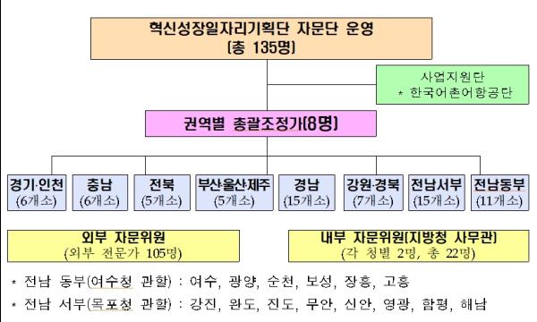 어촌뉴딜 300사업 자문단은 권역별 총괄 조정가와 내·외부 전문가 등 총 135명으로 구성되며, 사업 간 균형과 책임감 있는 사업관리를 위해 8대 권역으로 구분해 운영된다.