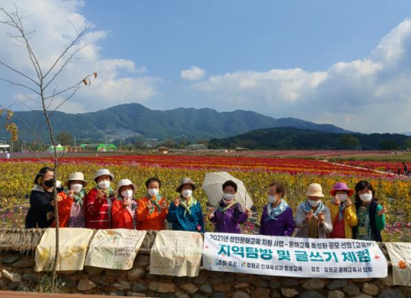 2021년 지원사업은 문해학습자들이 꽃길만 걷기를 바라는 소망을 담아 고석정 꽃밭 탐방과 천연 염색 손수건 위에 글과 그림을 그리며 앞으로도 맘껏 공부할 수 있을 날을 기대하는 마음으로 추진하고 있다.