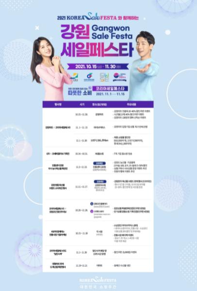 강원도는 전국 단위 대규모 할인행사인 코리아세일페스타 보다 앞선, 10월 15일부터 농·축·수산물 등 도내 상품의 소비 진작을 위한 ‘강원세일페스타’의 포문을 열고, 11월 말까지 할인 행사를 추진한다.