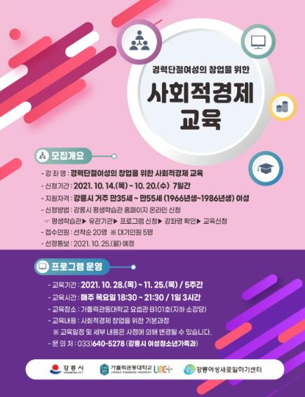 이번 교육은 강릉시와 가톨릭관동대학교 LINC 사업단, 강릉여성새로일하기센터가 공동으로 진행하며, 강릉시에 거주하는 만35세~만55세 경력단절여성을 대상으로 20일까지 강릉시평생학습관 홈페이지를 통해 온라인으로 선착순 신청가능하다.