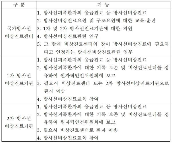원안위는 방사선 비상상황 발생 시 국가 차원의 체계적인 의료대응이 가능하도록 권역별 비상진료기관을 지정·운영하고 있으며, 비상진료기관의 의사·간호사·응급구조사 등 총 680여명을 비상진료요원으로 확보하고 있다.