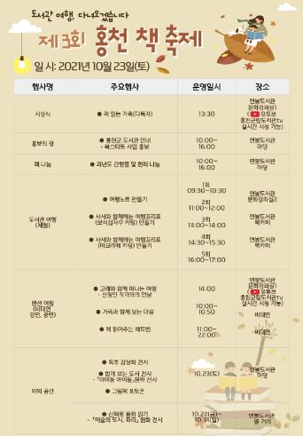 홍천 군립도서관이 오는 10월 23일 오전 10시부터 오후 5시까지 연봉도서관에서 제3회 홍천 책 축제를 개최한다.