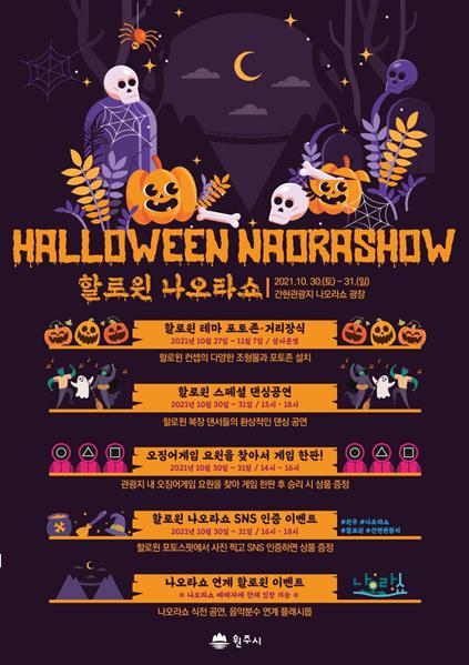 소금산 출렁다리에 이어 나오라쇼 개장으로 원주 관광의 중심으로 자리 잡은 간현관광지에서 할로윈데이를 맞아 또 하나의 이색 볼거리인 ‘할로윈 나오라쇼’가 화려하게 펼쳐진다.