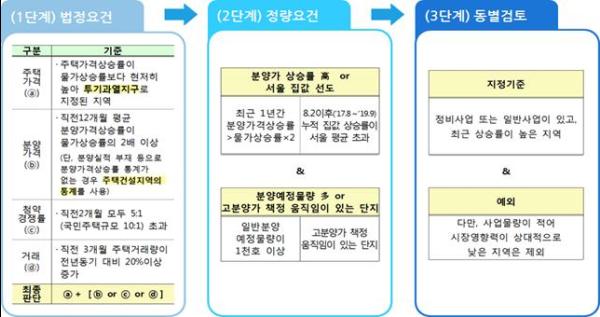 ‘최근 부동산 시장 점검 결과 및 보완방안’을 통해 밝힌 지정 방향과 같이, 최근 분양가격 상승률이 높고 집값 상승세가 지속되고 있어 시장 영향력이 큰 서울을 중심으로 지정 요건 충족 지역을 구 단위로 선별하고 해당 구 내의 정비사업·일반사업 추진 현황, 최근 집값상승률, 고분양가 책정 우려, 시장 영향력 등을 종합적으로 고려해 동 단위로 핀셋 지정하기로 했다.