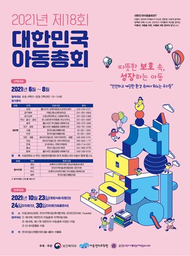 「대한민국 아동총회」는 전국 아동대표(만 10세~17세)들이 모여 아동과 관련된 사회문제를 토의하는 ‘아동 참여권 행사의 장(場)’으로서 2004년에 처음 개최되어 올해 제18회를 맞는 행사이다. 코로나19 상황을 고려하여 올해 총회는 개회식에 이어서 온라인(비대면)으로 3회(10월 23일, 24일, 30일)에 걸친 토의과정으로 진행될 예정이다.