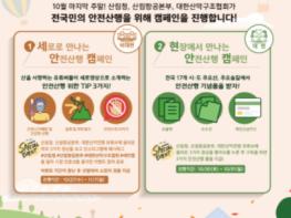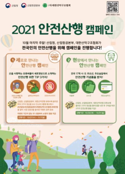 전국 17개 시·도 주요 산 및 숲길에서 2021.10.30.∼10.31 이틀간 산림청, (사)대한산악구조협회와 산림항공본부 약 100여 명이 산행안전 광고지 등 홍보물을 배포하면서 등산안전 캠페인을 추진한다.