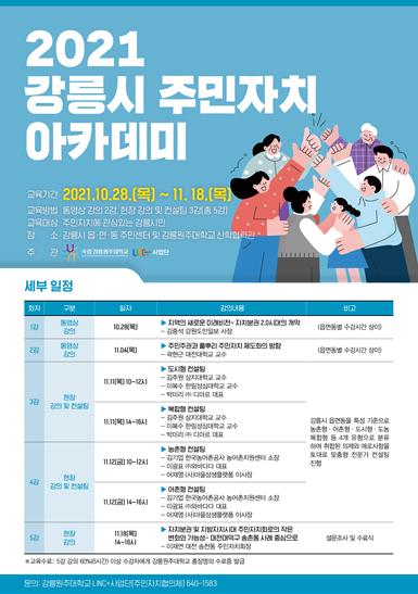 강릉원주대학교 LINC 사업단 주관으로 읍면동별 청사 회의실 및 강릉원주대학교 산합협력관 회의실에서 진행되며, 오는 28일(목) 강원도민일보 김중석 대표이사의 “지역의 새로운 미래비전-자치분권 2.0시대의 개막”을 주제로한 강의로 개강하여 총 9명의 전문강사를 통해 주민자치 실현을 위한 교육을 진행한다.