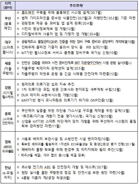 현장점검결과, 7개 특구 23개 사업중에서 대부분의 사업이 20년에 본격 실증에 착수할 계획으로 현재 사업추진을 위한 특구별 전담 추진체계를 구축을 완료하는 등 실증사업을 위한 준비작업을 진행하고 있다.