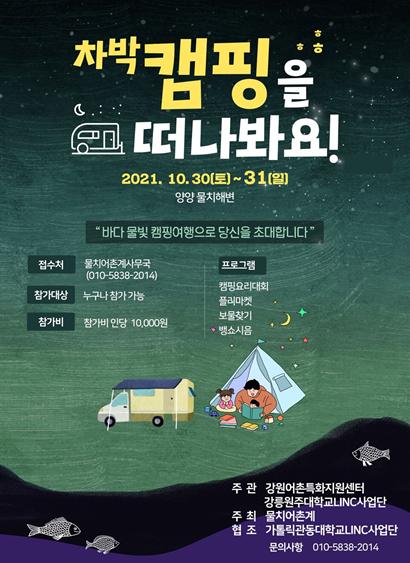 차박 캠핑의 유행에 따른 환경훼손 등 문제점을 고취하고, 해변 차박 에티켓 및 바다 사용법을 고민해보자는 취지의 이번 축제는 네이버 카페 ‘차박 캠핑클럽’과 협업하여 10월 30일부터 1박 2일 동안 강원어촌특화지원센터와 강릉원주대학교 LINC 사업단 공동주관 및 가톨릭관동대학교LINC 사업단 협조로 진행한다.