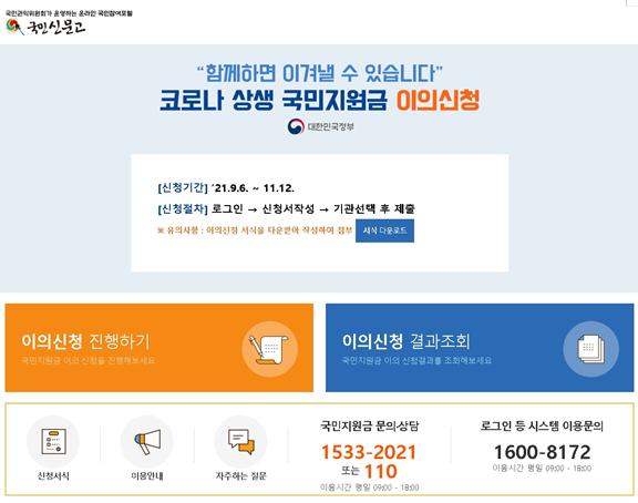 국민권익위원회는 국민신문고 국민지원금 이의신청 창구를 11월 12일까지 운영한다고 밝혔다. 코로나 상생 국민지원금 신청은 오늘(10월 29일) 오후 6시에 마감된다. 이의신청은 증빙서류 준비 등에 따른 부담을 고려해 국민지원금 신청보다 2주 연장된 11월 12일까지 가능하다.